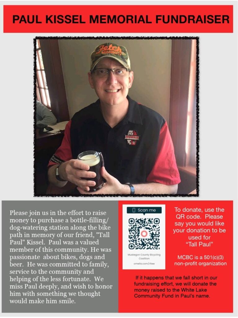 To celebrate Paul’s memory, the Muskegon County Bicycling Coalition (MCBC) is spearheading a fundraising effort to install a much-needed bottle-filling and dog-watering station along the bike path near the White Lake Area Chamber & Visitors Bureau. Currently, there are no watering stations between Muskegon and Shelby, making this an ideal location to serve cyclists, pedestrians, families, and pets alike.