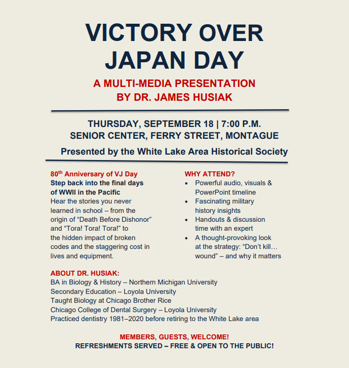 The featured program, “Victory Over Japan Day”, commemorating the 80th anniversary of VJ Day, will be presented by Dr. James Husiak, whose rich educational and professional background brings depth and authority to this important historical topic. He is an engaging, knowledgeable speaker and will provide well-researched handouts based on his presentation.
