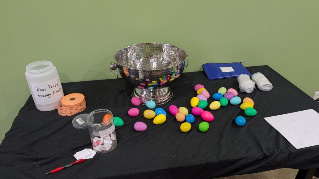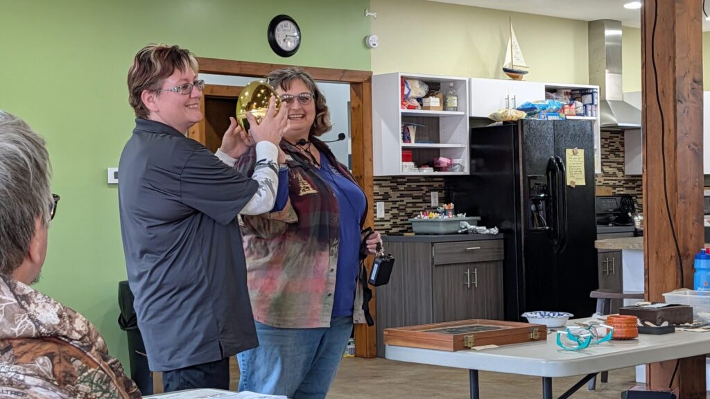 Director at Large and Field Trip Coordinator Jennifer Stanton and Club President Chris Rogers show off the Golden Egg, a surprise-filled highlight that drew excitement and bids from the crowd.