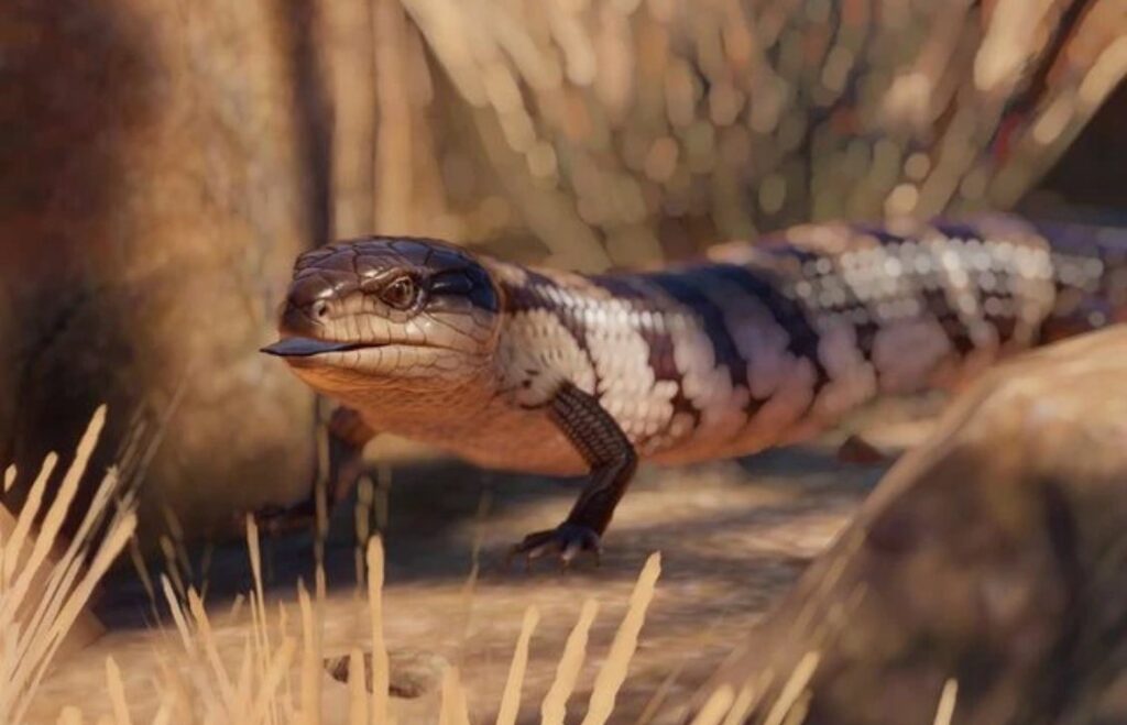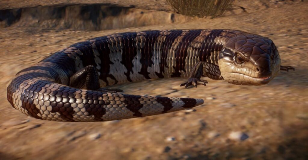 8. Covered in smooth grayish brown scales with black stripes; blue tongued skinks can blend in with the environment as well to keep away from predators like dingoes , foxes