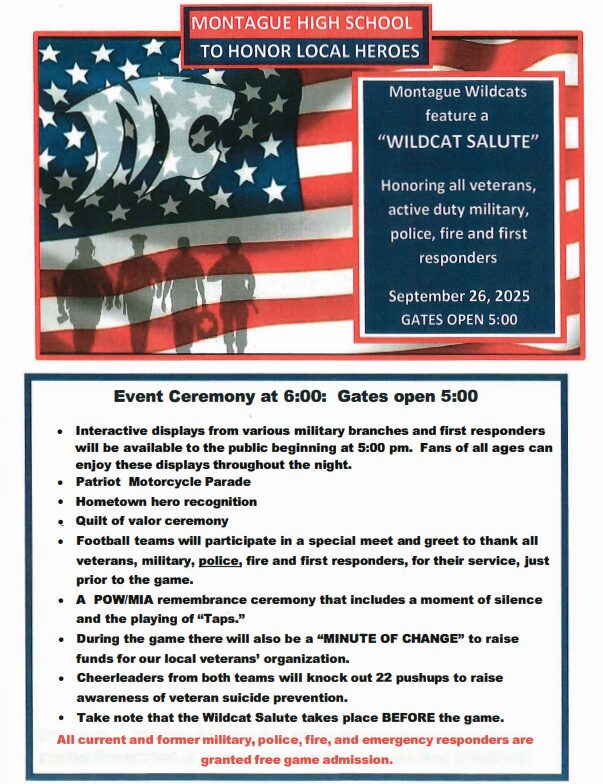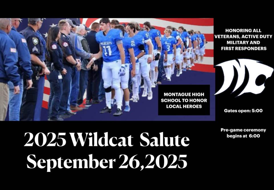 MONTAGUE — The Montague community will gather on Friday, Sept. 26, 2025 at Montague High School for the annual Wildcat Salute, a moving pregame ceremony honoring veterans, active-duty military, police, fire, and emergency responders. Gates open at 5:00 p.m.; the ceremony begins at 6:00 p.m. (The Salute takes place before the game.)